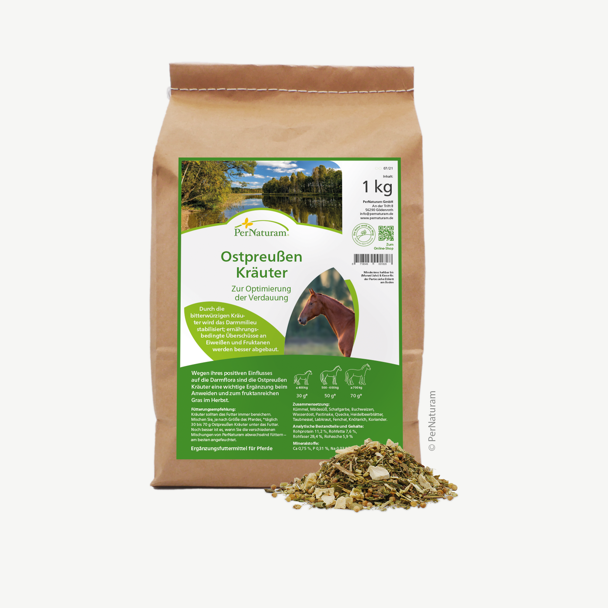 Die Ostpreußen Kräuter für Pferde von PerNaturam sind besonders wichtig für Pferde, die mit eiweiß- und fruktanreichen Gräsern gefüttert werden. Diese Kräutermischung hilft Pferden, die häufig unter Verdauungsstörungen wie Durchfall, Kotwasser, Koliken oder Hufrehe leiden. Besonders im Frühling, wenn das frische Gras für den Darm eine hohe Belastung darstellt, und auch bei Heu von artenarmen Wiesen im Winter, ist diese Mischung eine wertvolle Unterstützung.