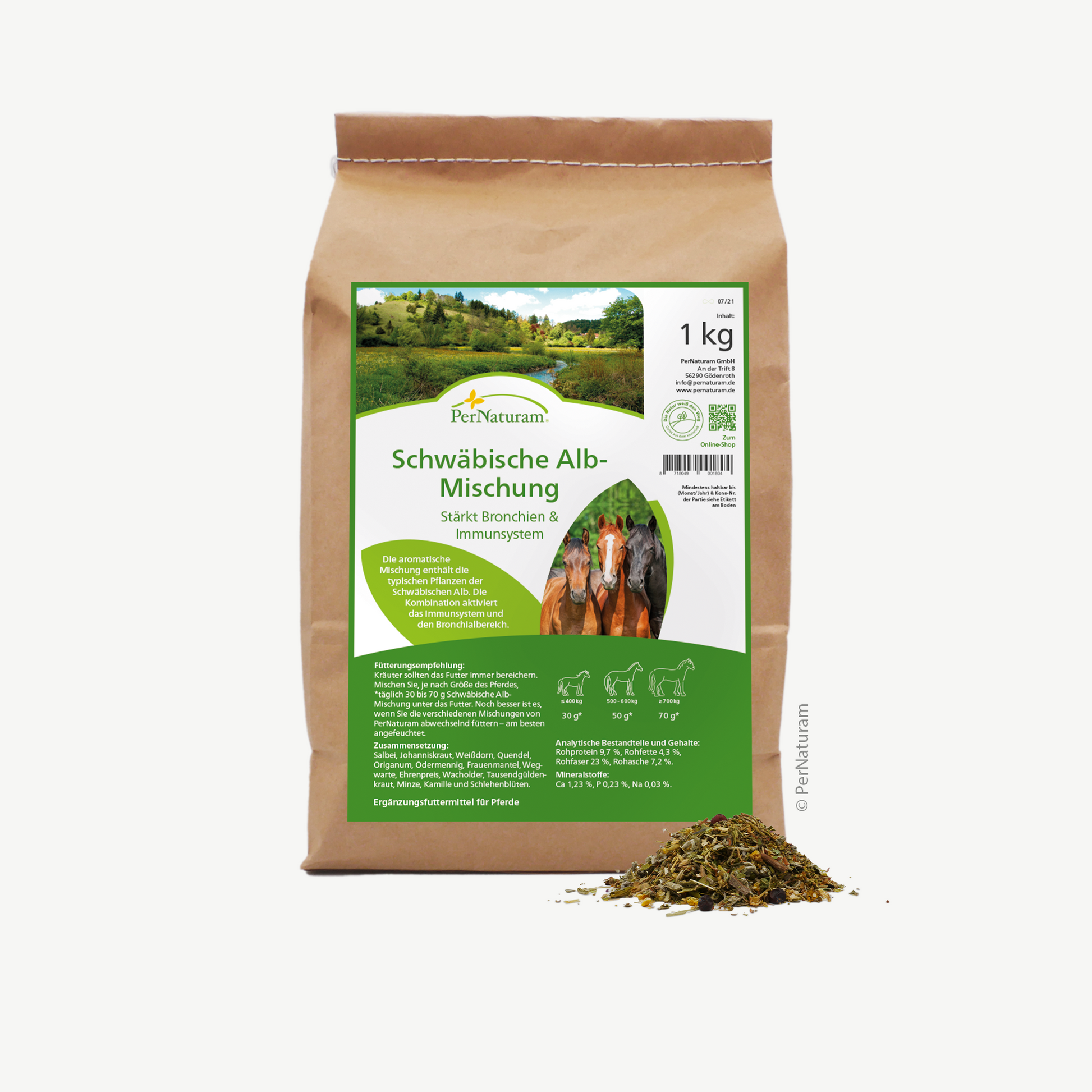Natürlich & wohltuend: Die Schwäbische Alb-Kräutermischung von PerNaturam bietet Deinem Pferd die Kraft der Natur – für mehr Vitalität, starke Atemwege und ein ausgeglichenes Immunsystem. Setze auf die robuste Vielfalt der Natur – mit der Schwäbischen Alb-Kräutermischung für Dein Pferd!