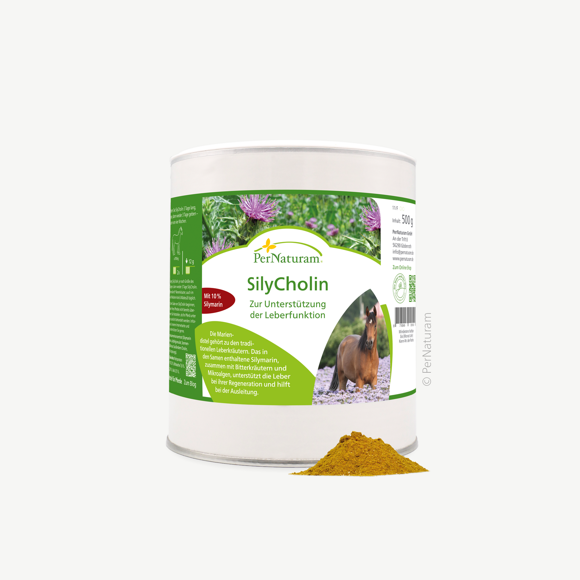 Sily Cholin – Unterstützung für die Lebergesundheit Deines Pferdes Sily Cholin basiert auf der bewährten Kraft der Mariendistel, einem traditionellen Leberkraut. Das in den Samen enthaltene Silymarin, kombiniert mit ausgewählten Bitterkräutern und Mikroalgen, unterstützt die Leber Deines Pferdes effektiv bei der Regeneration und fördert die natürliche Ausleitung von Stoffwechselendprodukten.